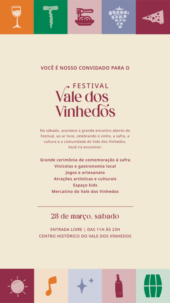 No sábado, 28, o festival se abre ao público com um grande evento ao ar livre no Centro Histórico do Vale dos Vinhedos, com entrada gratuita. A programação integra vinícolas, gastronomia, feira de produtos locais, oficinas culturais e atrações artísticas, destacando tradições como a pisa das uvas e a cerimônia de celebração da safra.