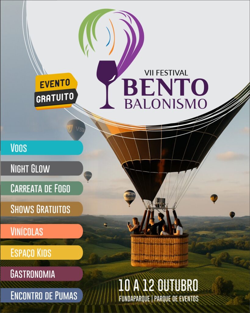 A 7ª edição do Bento Balonismo acontece no próximo fim de semana em Bento Gonçalves. De 10 a 12 de outubro, o céu da cidade ganha o colorido do Festival. O evento na Fundaparque também celebra o aniversário de 135 anos do Município. Tradicional na cidade, o Festival de balonismo contará, no dia 10 de outubro, com os voos partindo dos bairros da cidade. Serão ações no São Roque, Borgo, São João, Fátima e São Valentin. No mesmo dia, ainda será realizada a tradicional carreata de fogos, Night Glow e shows com Dj. Alex de Assis, Disco Groove e Vitor Henrique e Gabriel.