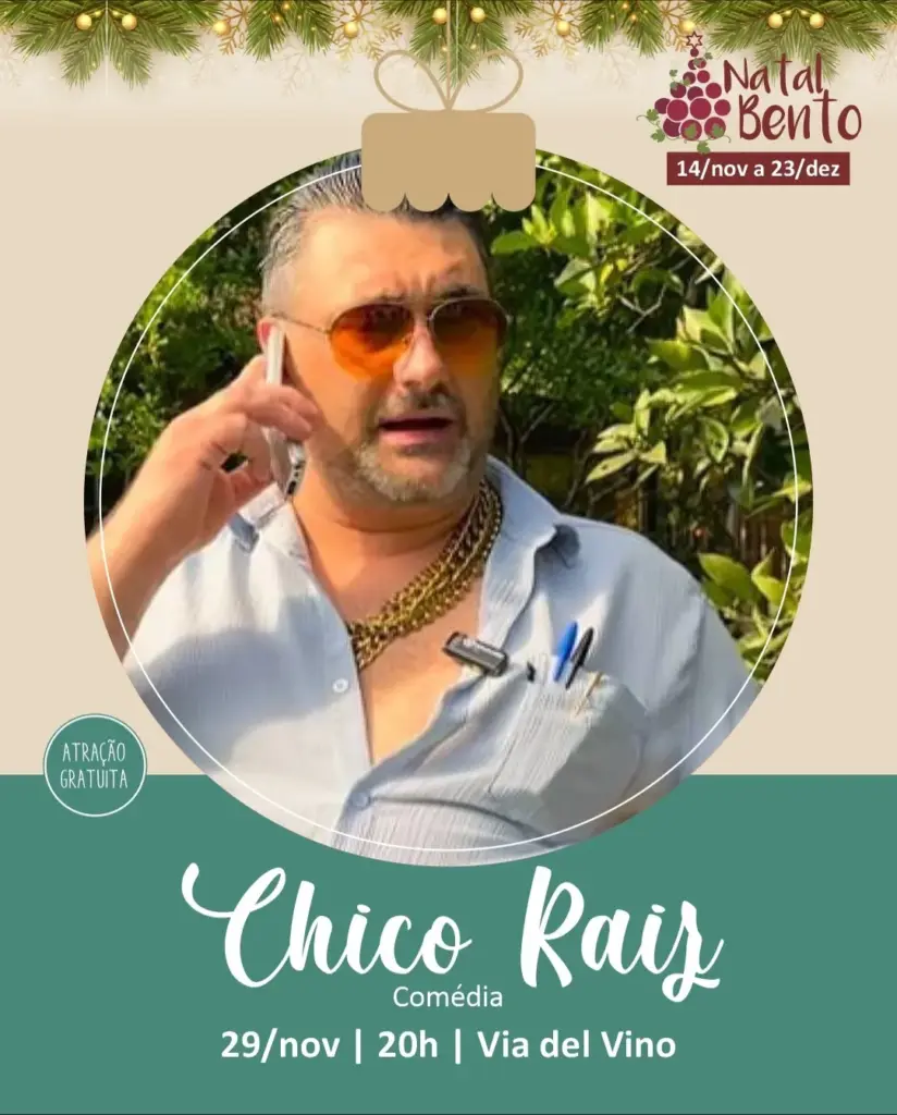 A Igreja Santo Antônio recebe o Encontro de Coros Natalinos. Já na Via del Vino, a programação segue com a apresentação dos Canarinhos, às 19h, e com o humorista Chico Raiz, a partir das 20h. Francisco Cechin Junior, que viralizou com vídeos e esquetes satirizando vendedores e a rotina do Sul, interpreta o personagem de sotaque serrano, visual marcante e dono do famoso “Bar do Chico”. No Vale dos Vinhedos, ocorre a apresentação do espetáculo Christmas Celebration.
