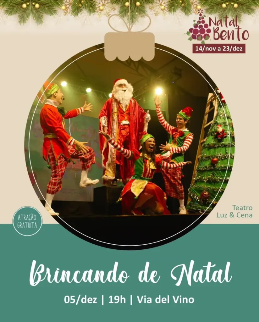 A programação do Natal Bento segue movimentando Bento Gonçalves com atrações para toda a família. O fim de semana será marcado por teatro, apresentações dos Serviços de Convivência e Fortalecimento de Vínculos, além de música com o Vocal Allegro e a cantora Tati Freitas.