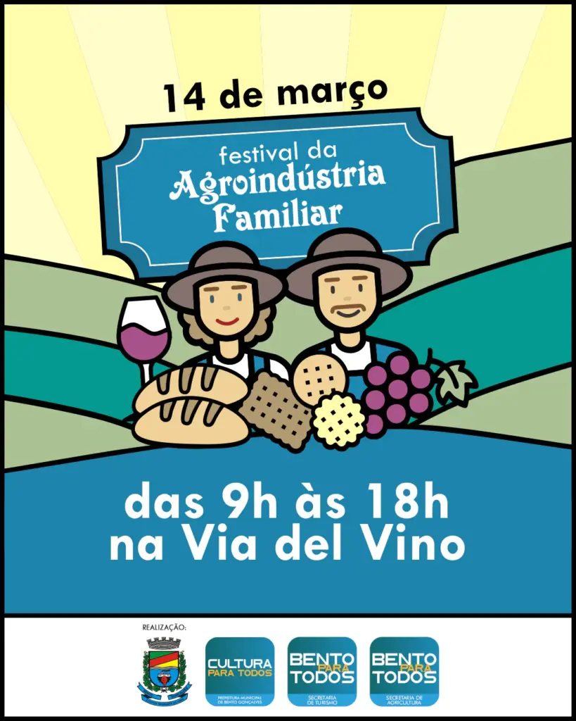 No próximo sábado (14), a Via del Vino será palco de um dia especial com agricultura, dança, gastronomia típica, música e pisa das uvas, integrando a programação do Bento em Vindima. Das 9h às 18h, acontece o Festival da Agroindústria Familiar, com a comercialização de produtos coloniais como pães, biscoitos, cucas, vinhos, geleias, entre outros produtos.