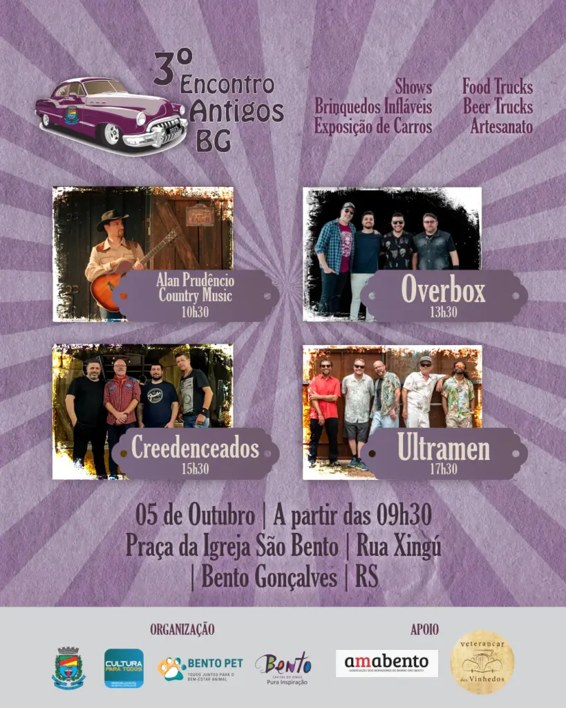 O 3º Encontro Antigos BG é realizado em conjunto entre as Secretarias de Cultura, Turismo e Bento Pet. A inscrição para expor os carros antigos será realiza perante a doação de 1kg de ração e deve ser feita no dia do evento. O alimento será encaminhado para o departamento Bento-Pet, da secretaria de Meio Ambiente.