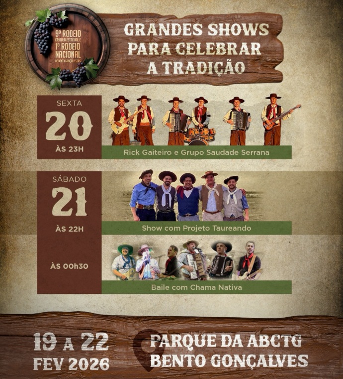 Em fevereiro de 2026, a tradição gaúcha toma conta da Serra com provas campeiras, competições artísticas e grandes nomes da música tradicionalista. O evento fortalece a cultura tradicionalista na região, movimenta a economia local e projeta Bento Gonçalves na agenda estadual e nacional do tradicionalismo.