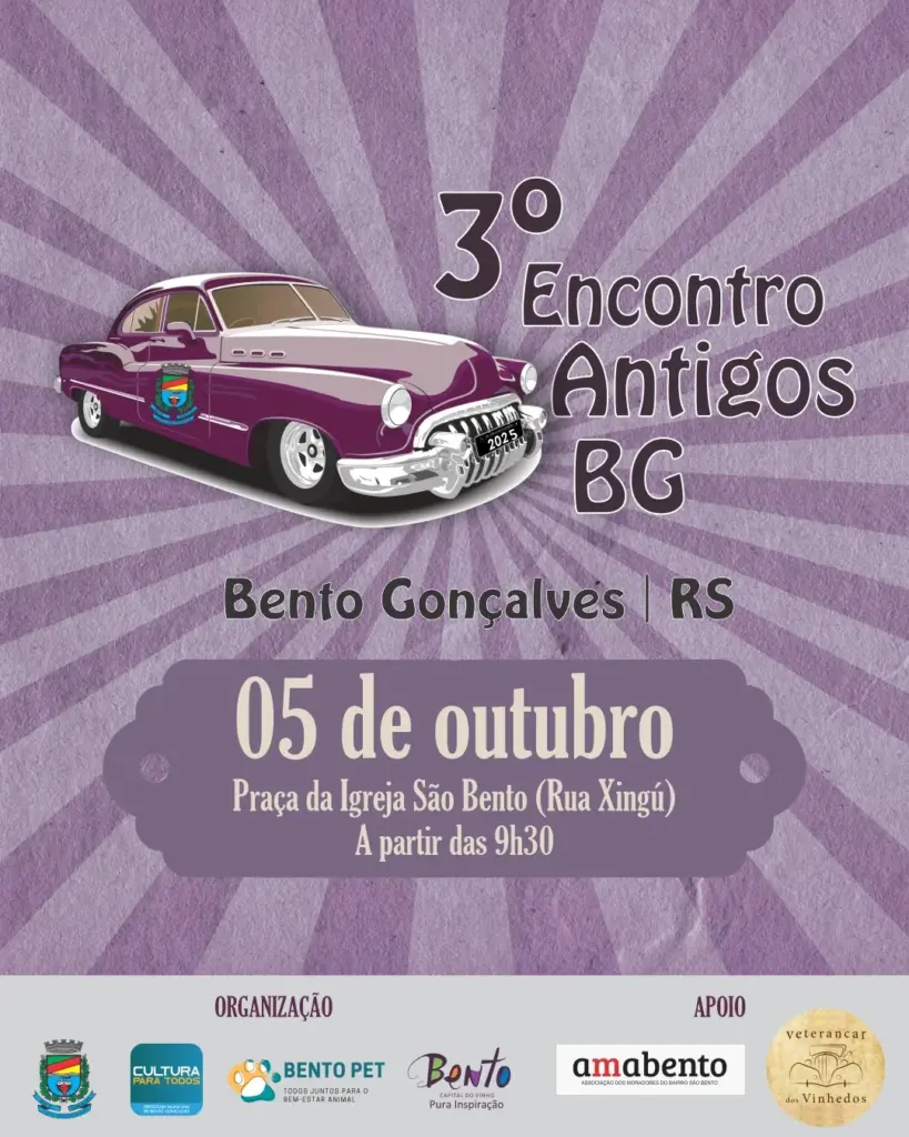 O 3º Encontro Antigos BG é realizado em conjunto entre as Secretarias de Cultura, Turismo e Bento Pet. A inscrição para expor os carros antigos será realiza perante a doação de 1kg de ração e deve ser feita no dia do evento. O alimento será encaminhado para o departamento Bento-Pet, da secretaria de Meio Ambiente.