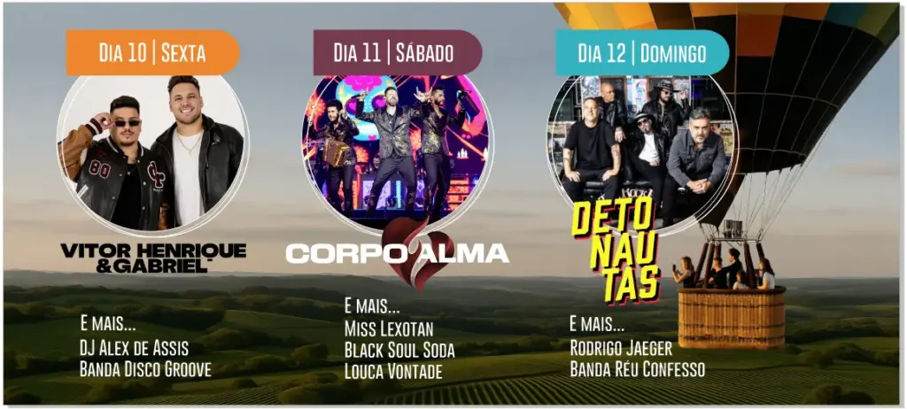Dia 11 de outubro- sábado 06h30- Voo competitivo 12h- Abertura do parque 14h30- Miss Lexotan 16h30- 2º voo competitivo 17h- Black Soul Soda 18h30- Louca Vontade 19h30- Carreata de fogos partindo do Hotel Dall’Onder, Prefeitura até a Fundaparque 20h- Nightglow 21h Corpo e Alma