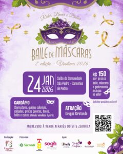 Um resgate cultural enriquecido por elementos que contam a história dos bailes dos anos 1920, realizados na comunidade de São Pedro. Esta é a proposta central do Baile de Máscaras ‘Rider, Bever e Balar’, evento que chega à sua segunda edição em 2026, realizado pelo Roteiro Caminhos de Pedra. Acontece no dia 24 de janeiro, no salão da Comunidade de São Pedro, a partir das 20h30min, proporcionando uma verdadeira imersão na história e nas tradições locais.