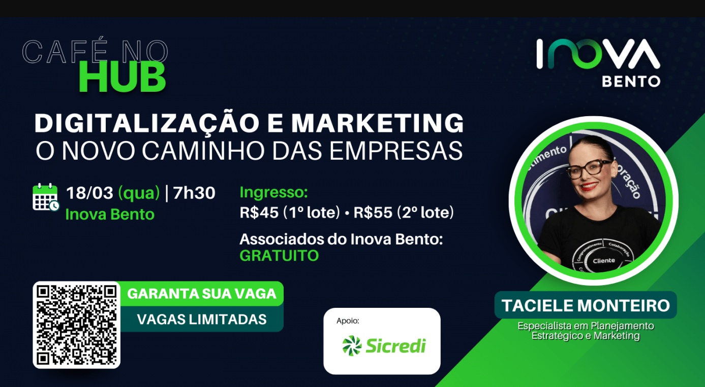 O InovaBento recebe mais uma edição do Café no HUB, desta vez com o tema Digitalização e Marketing: O Novo Caminho das Empresas, com Taciele Monteiro.