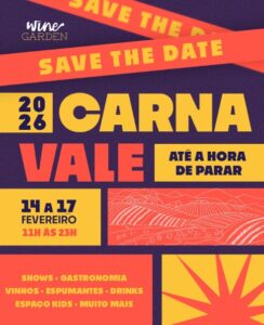 De 14 a 17 de fevereiro, o Wine Garden será palco de mais uma edição do Carnavale | Até a hora de parar — um festival das 11h às 23h, entre vinhedos, música, arte e muita celebração.