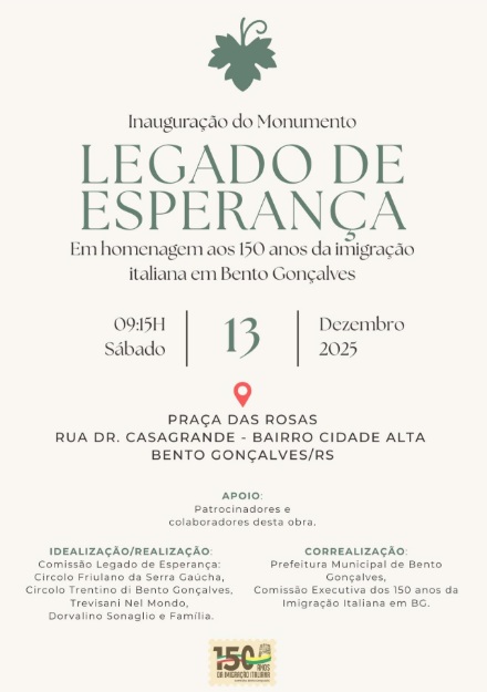 9:15h – inauguração do monumento aos 150 anos da imigração italiana no RS, uma obra esculpida em basalto com o nome ‘Legado de Esperança’, retratando um casal de imigrantes em sua chegada às novas terras.