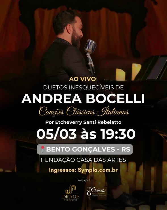 Nesse espetáculo são interpretados grandes duetos da carreira do tenor de Andrea Bocelli, nas vozes do tenor Etcheverry Santi Rebelatto e soprano Maíra Lautert Scheeren.