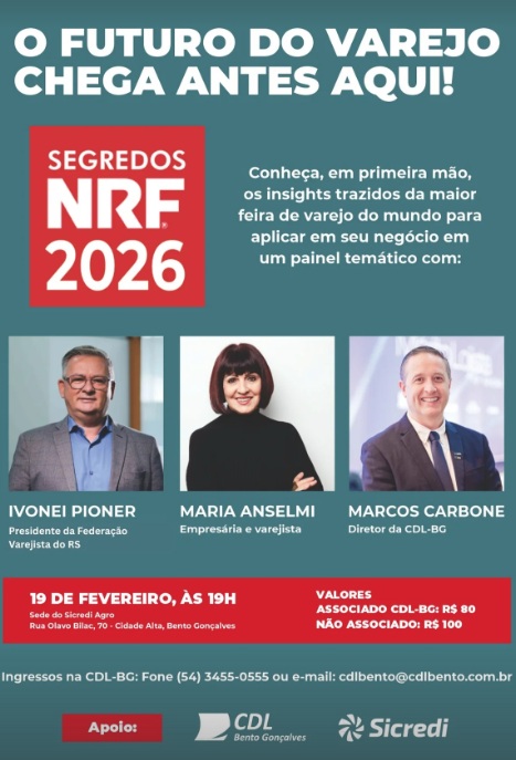 O encontro compartilhará percepções, tendências e práticas observadas na NRF 2026, traduzindo os conteúdos internacionais para a realidade dos negócios locais. Será conduzido em formato de painel temático, com Ivonei Pioner, presidente da Federação Varejista do Rio Grande do Sul, Marcos Carbone, vice-presidente da Federação e diretor da CDL-BG e Maria Anselmi, empresária e varejista.