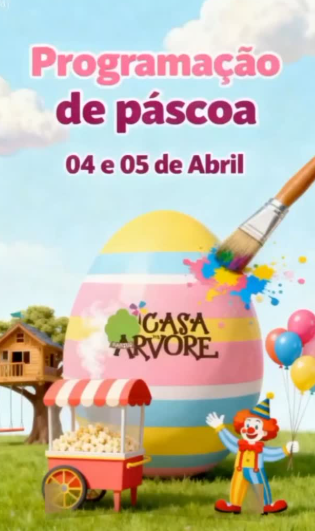 Um final de semana especial com muita diversão para toda a família! Um passeio cheio de alegria, natureza e momentos inesquecíveis no Parque Casa na Árvore. Caça aos ovos, oficina de pintura, carrinho de pipoca, balões, palhaço e fogueirinha com marshmallows + todas as nossas atrações!