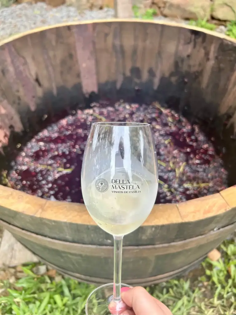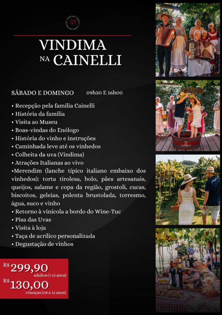 O momento mais esperado acontece na pisa das uvas na mastela, revivendo a tradição dos imigrantes italianos com taças cheias e muita alegria. Após um passeio pela loja da vinícola, a experiência segue para o Restaurante Videiras, onde é servido um autêntico almoço italiano em sequência, harmonizado com espumantes, vinhos e sucos.